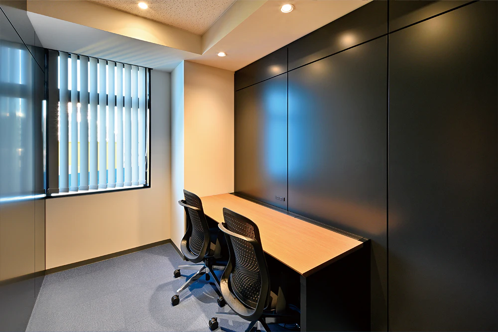 コミュニケーションエリアでは、オンライン会議の増加を受けて、大・中会議室に加え、2名用のミーティングスペースを用意。用途に合わせて柔軟に使用できるようにしました。
