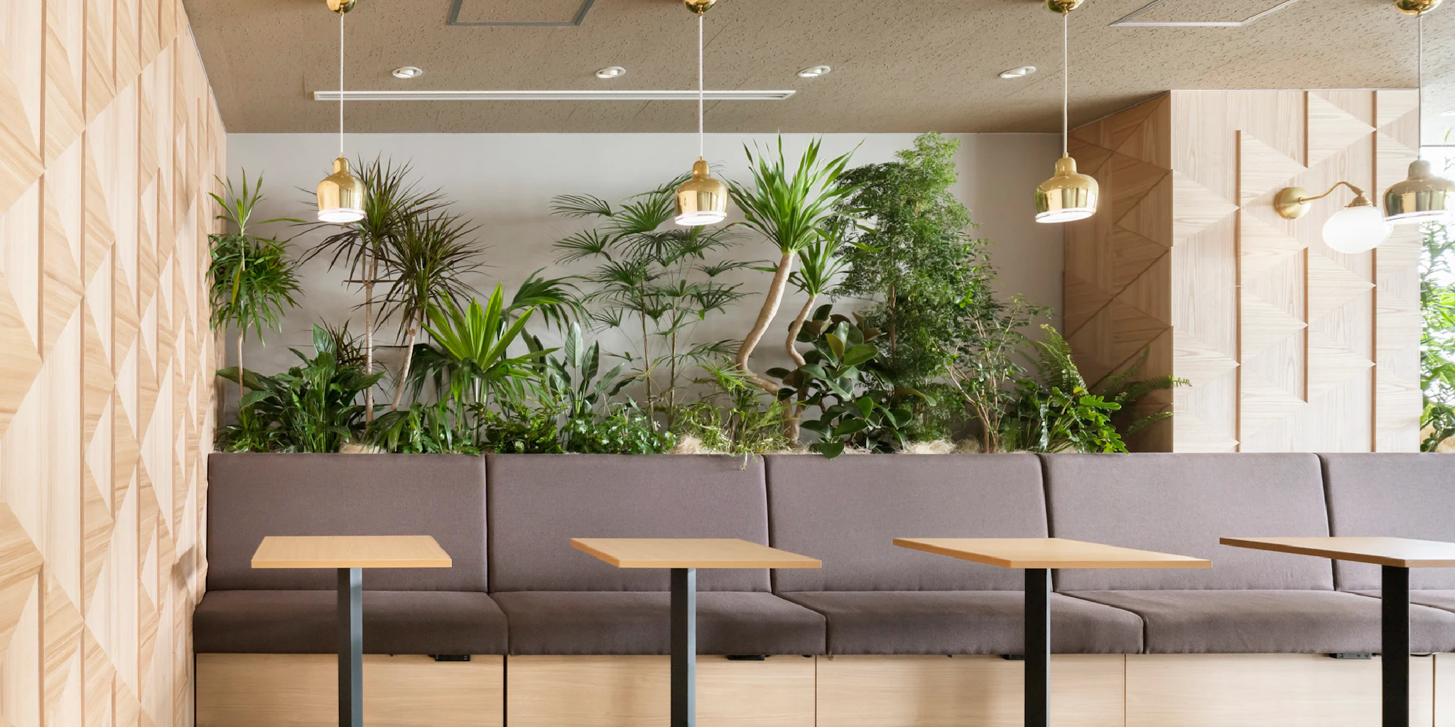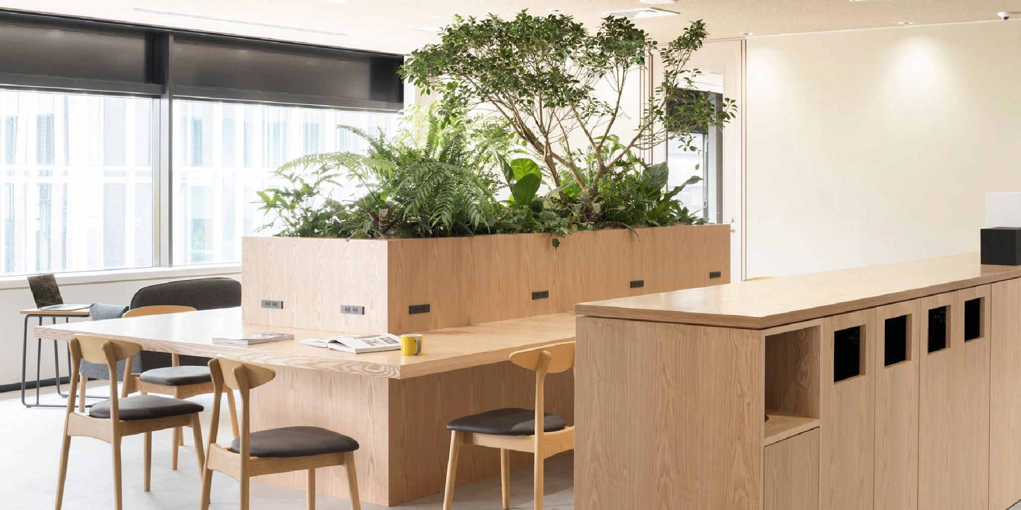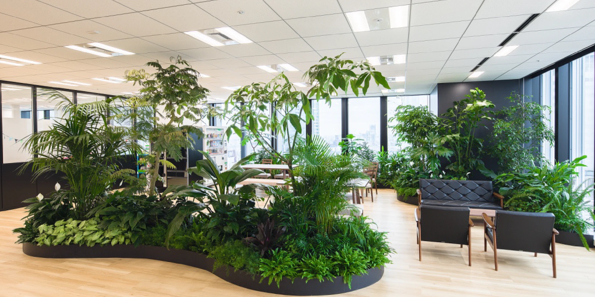植物が空間の一部となり、オフィスの動線やワークスペースの形に影響を与えるような取り入れ方は、近年のトレンドとなっている。