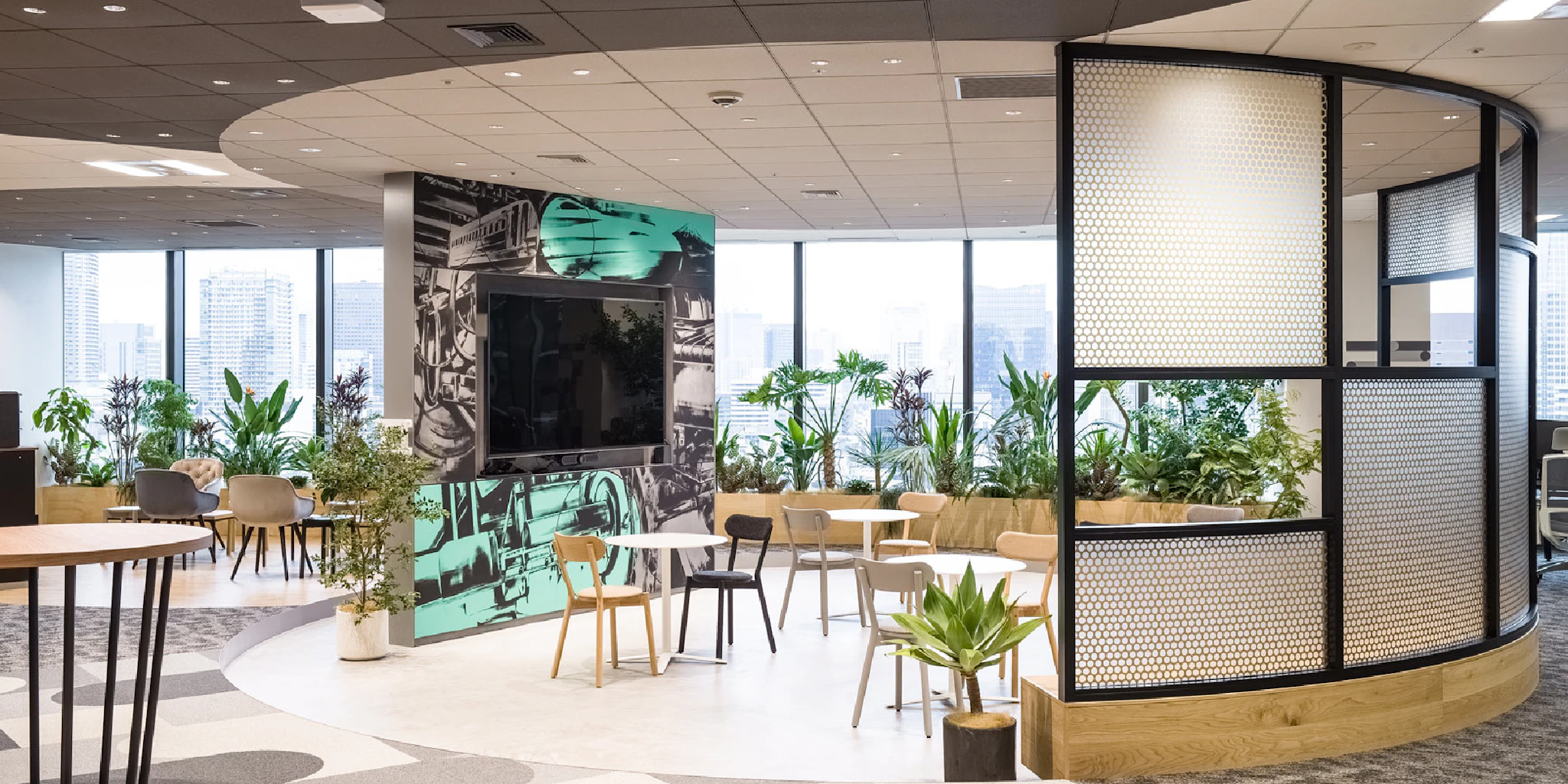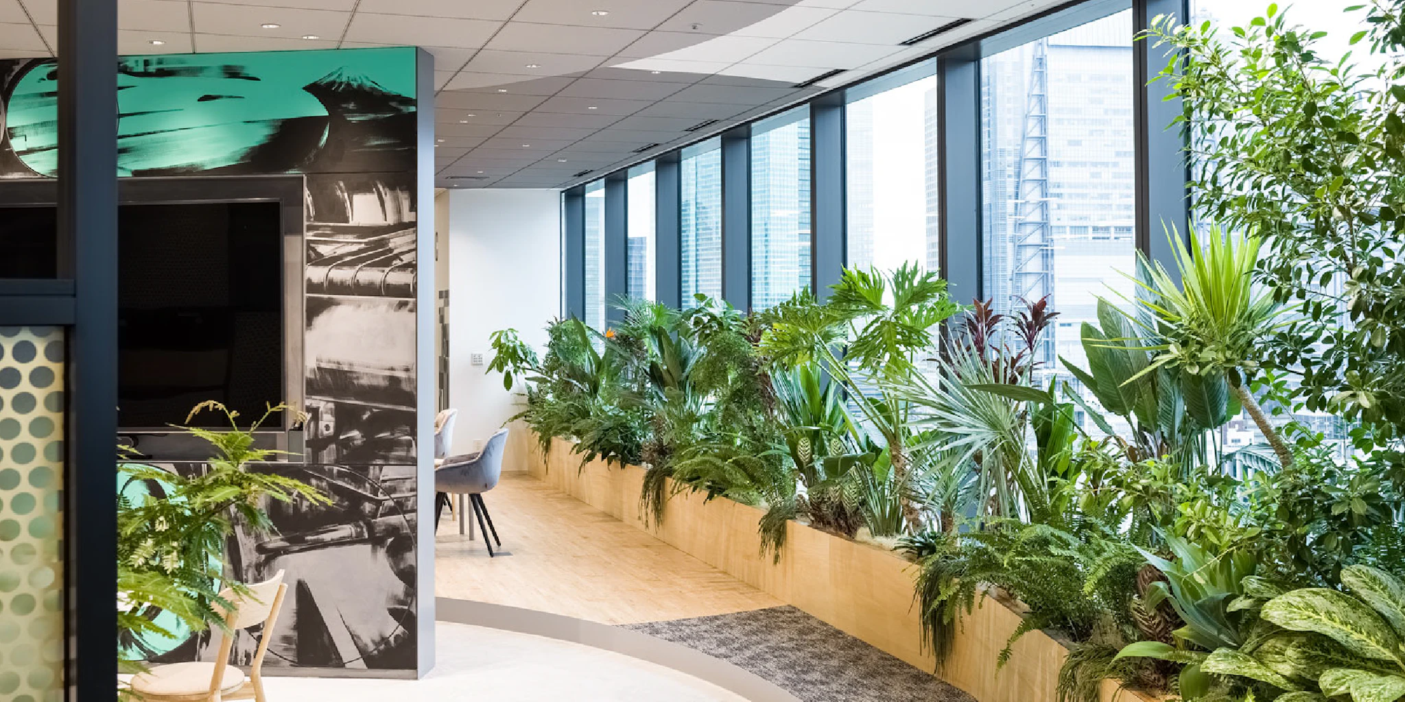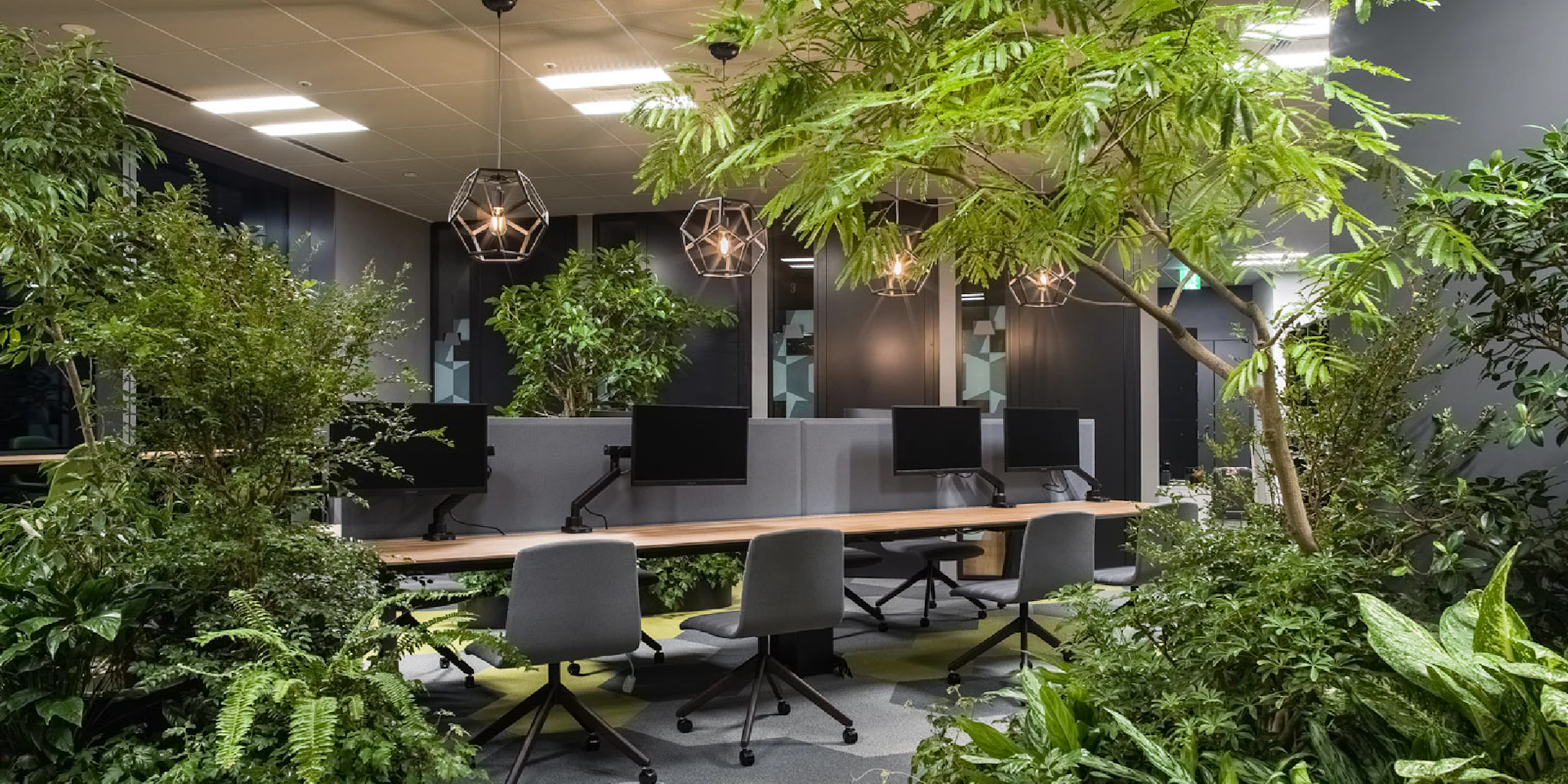 植物が空間の一部となり、オフィスの動線やワークスペースの形に影響を与えるような取り入れ方は、近年のトレンドとなっている。