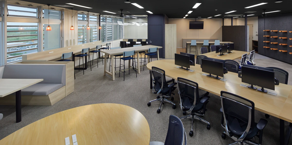 ICT KŌBŌ® URUMAでは、ワークスペースはベンチシート、ハイカウンター、ソロブースなどオリジナル什器を使用した空間設計を行っており、状況や気分に応じて仕事に取り組めるようになっており、業務に応じて柔軟な働き方を取ることができます。