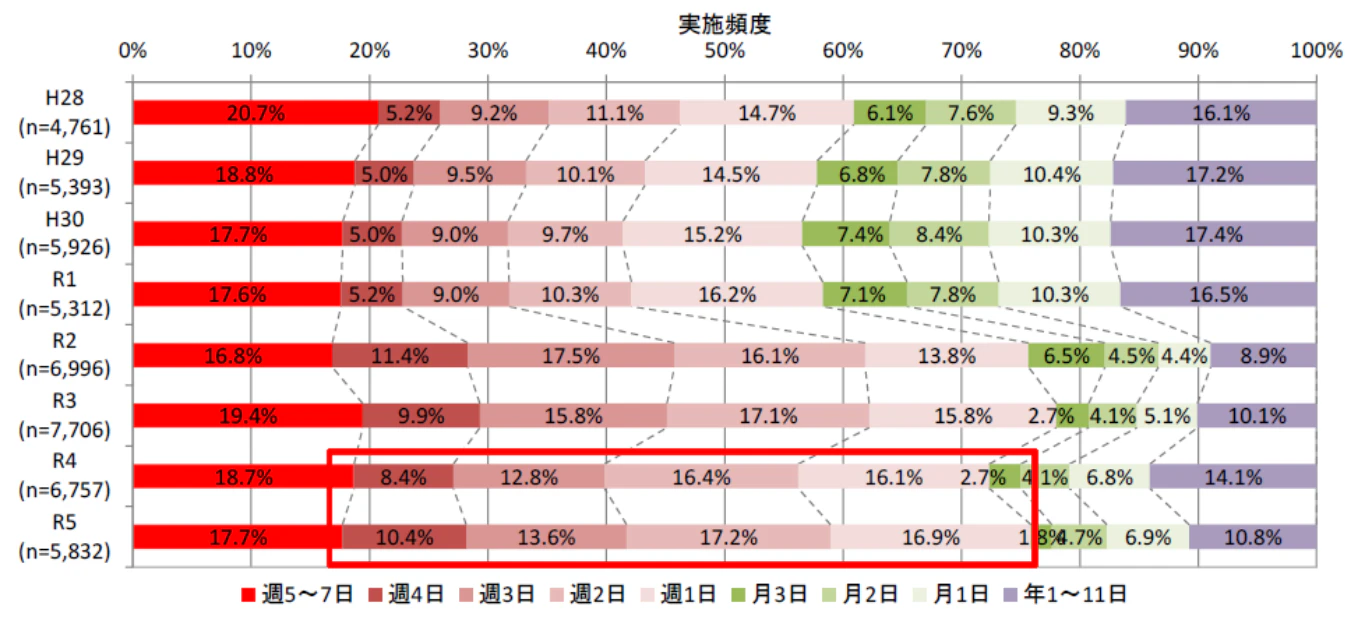 このうち、テレワークの実施頻度の内訳を見てみると、週4は10.4%、週3は13.6%、週2は17.2%、週1は16.9%です。この結果から、ハイブリッドワークを導入している企業の中では、週2~3日程度の実施がもっとも多いことがわかります。