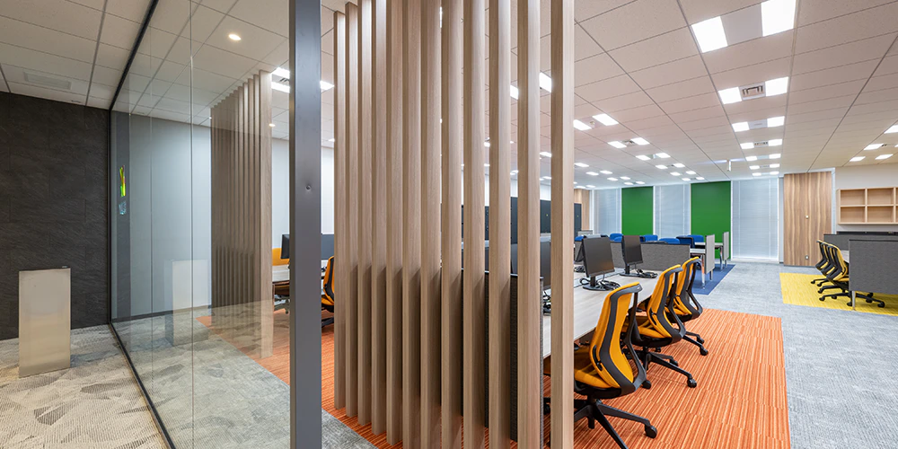 遮蔽物の少ないオープンな設計の中で、ブランドカラーを差し色として効果的に使用しています。自社製品のディスプレイ棚を設置し、企業カラーと製品色を空間デザインに統合することで、企業アイデンティティを表現しながら開放的な空間を生み出しています。
