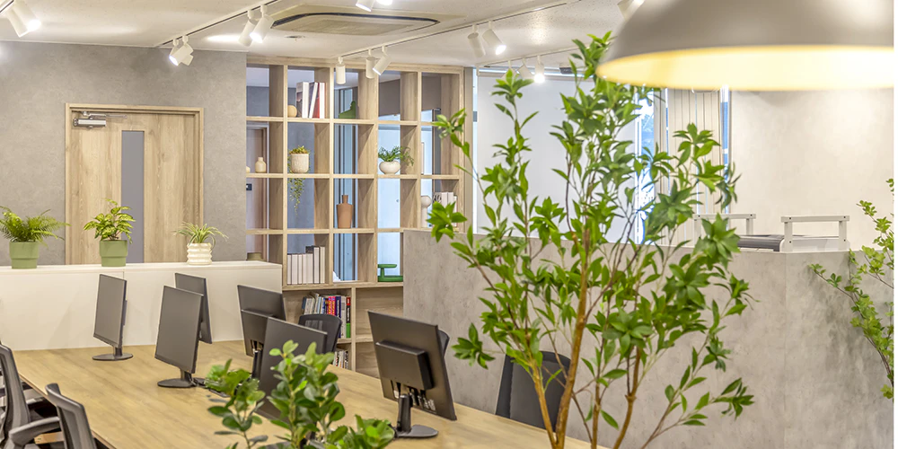 執務エリアには緑を効果的に配置し、明るく開放的な雰囲気を演出。造作家具として制作した10人用のビッグテーブルやディスプレイ棚が、空間の魅力を高めています。また、スポットライトを用いたカフェのような照明計画や、木目調の床材・什器の採用により、リラックスできる雰囲気を実現しています。