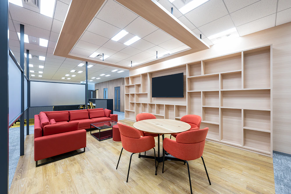 また、リビングルームのような居心地の良い空間を設けることも有効です。木目調のテーブルやソファ席を配置し、自宅にいるようにリラックスできる雰囲気をつくることで、社員同士が気軽に会話できる環境が生まれます。