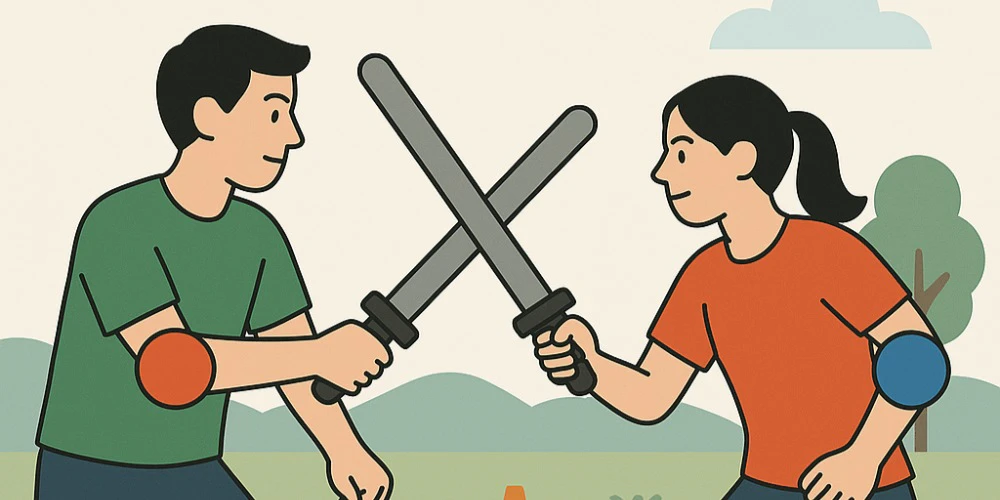 - 1. 会場に障害物を配置し、各チームはスポンジの刀を持って戦う