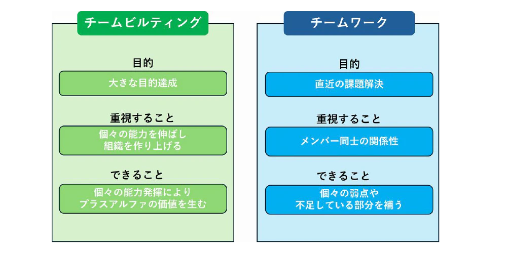 チームワークとチームビルディングは似て非なるものです。チームワークは、既存のチーム内で協力して業務を遂行する際の姿勢や行動を指します。一方、チームビルディングは、そのチームワークを効果的に機能させるための基盤づくりと言えるでしょう。