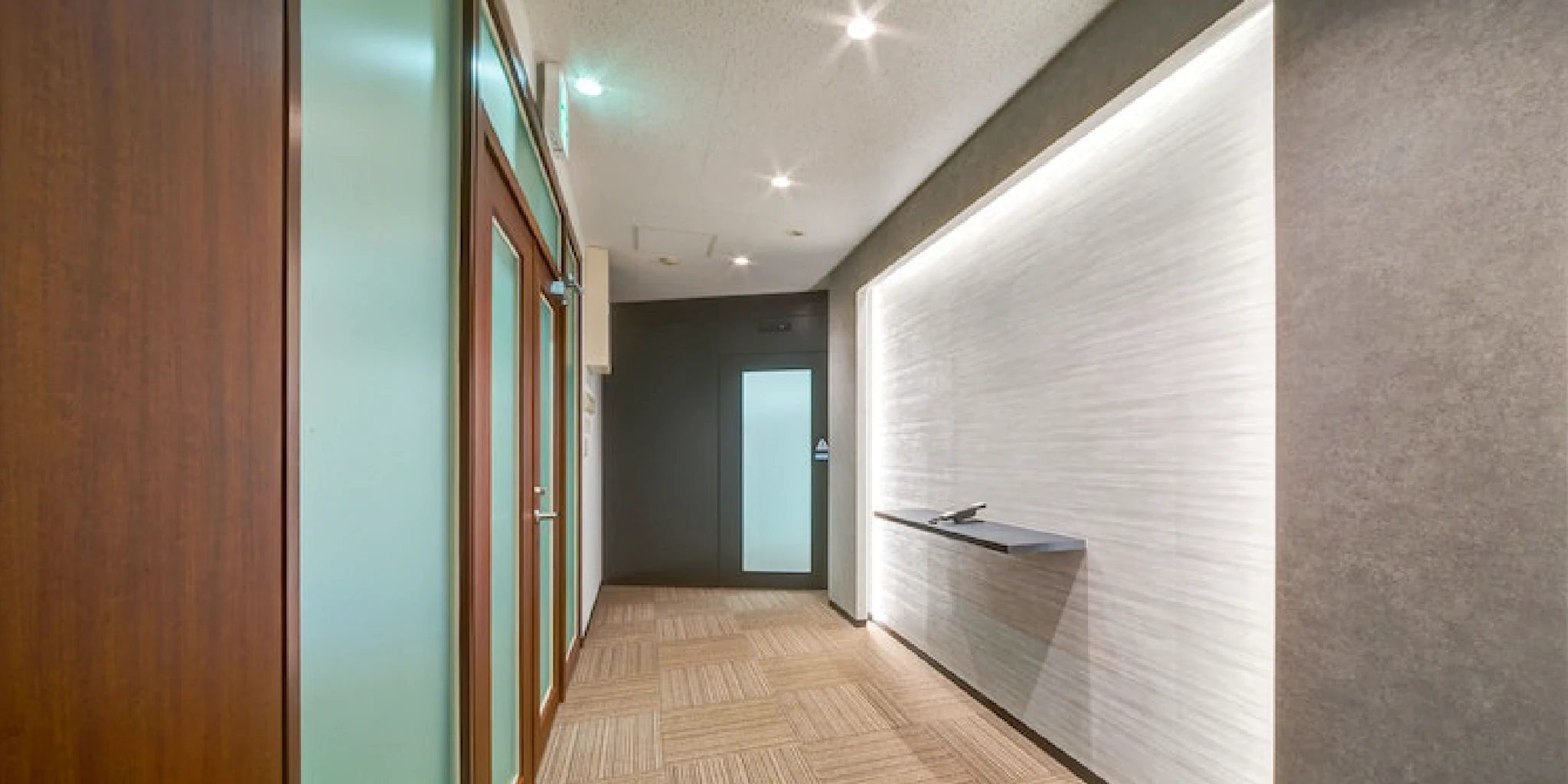エントランスには、もともと蛍光灯を設置していましたがすべて撤去し、ダウンライトに変更しました。一般的なオフィスより色温度を下げて上質な空間を演出し、来訪者の方に企業のブランドが伝わるように仕上げられています。