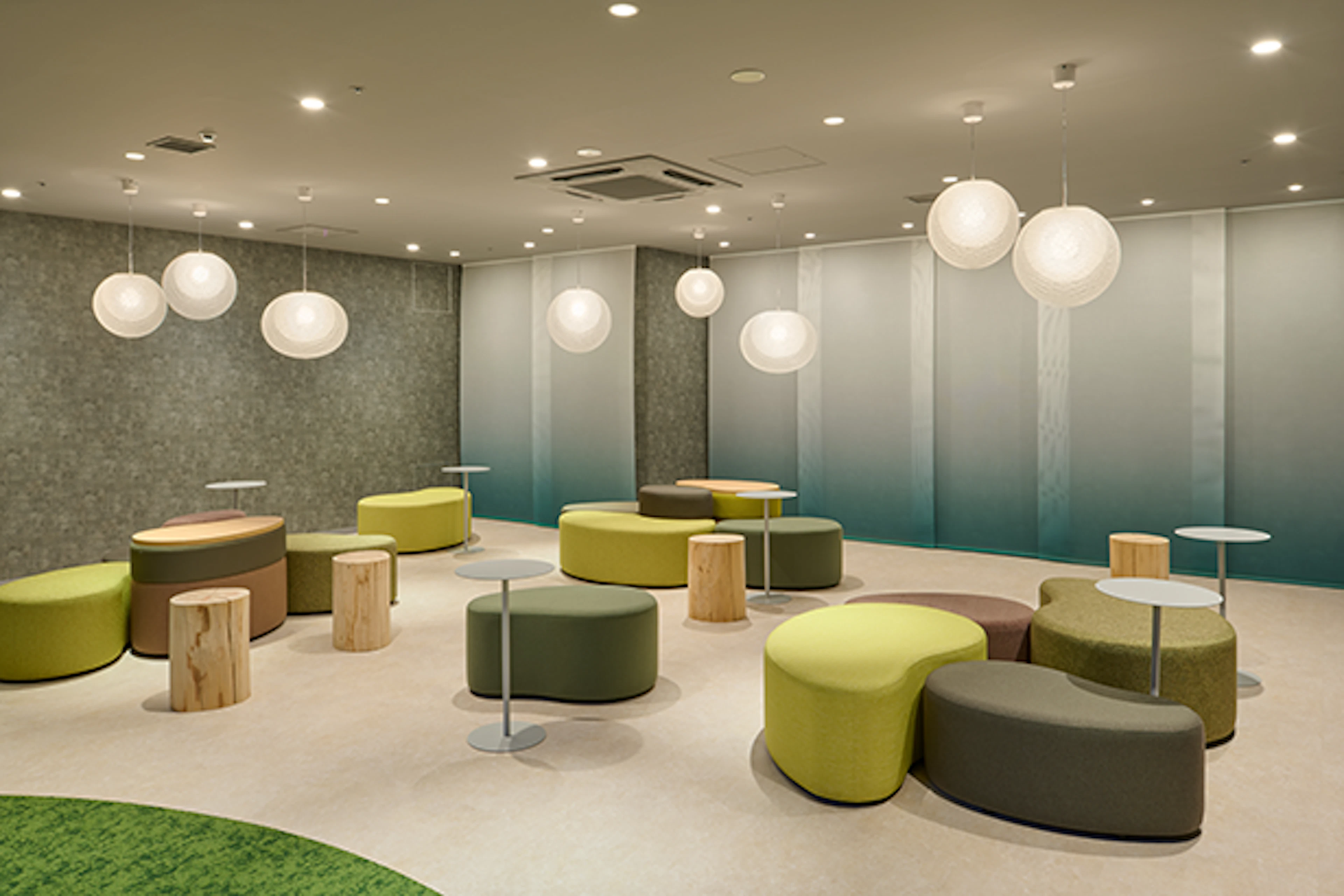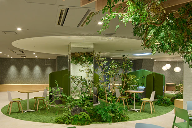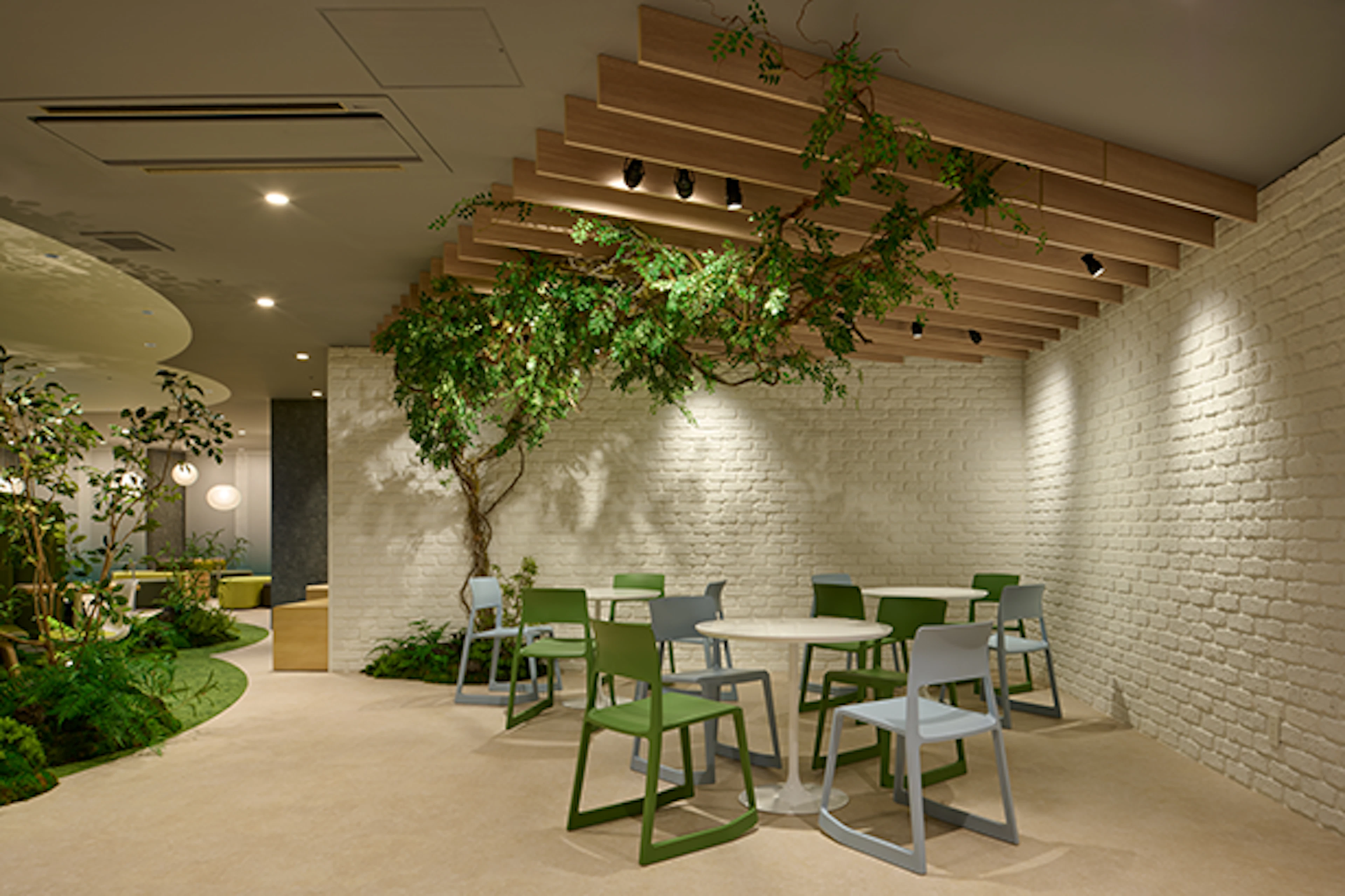 また、天井のルーバー「フォルティナ」に緑を組み込むことでテラスのような雰囲気を創出。環境への配慮として、壁面パネルやルーバーには塩ビと比べCO2排出量が少ないオレフィン素材を採用し、サステナブルな空間づくりも実現しています。