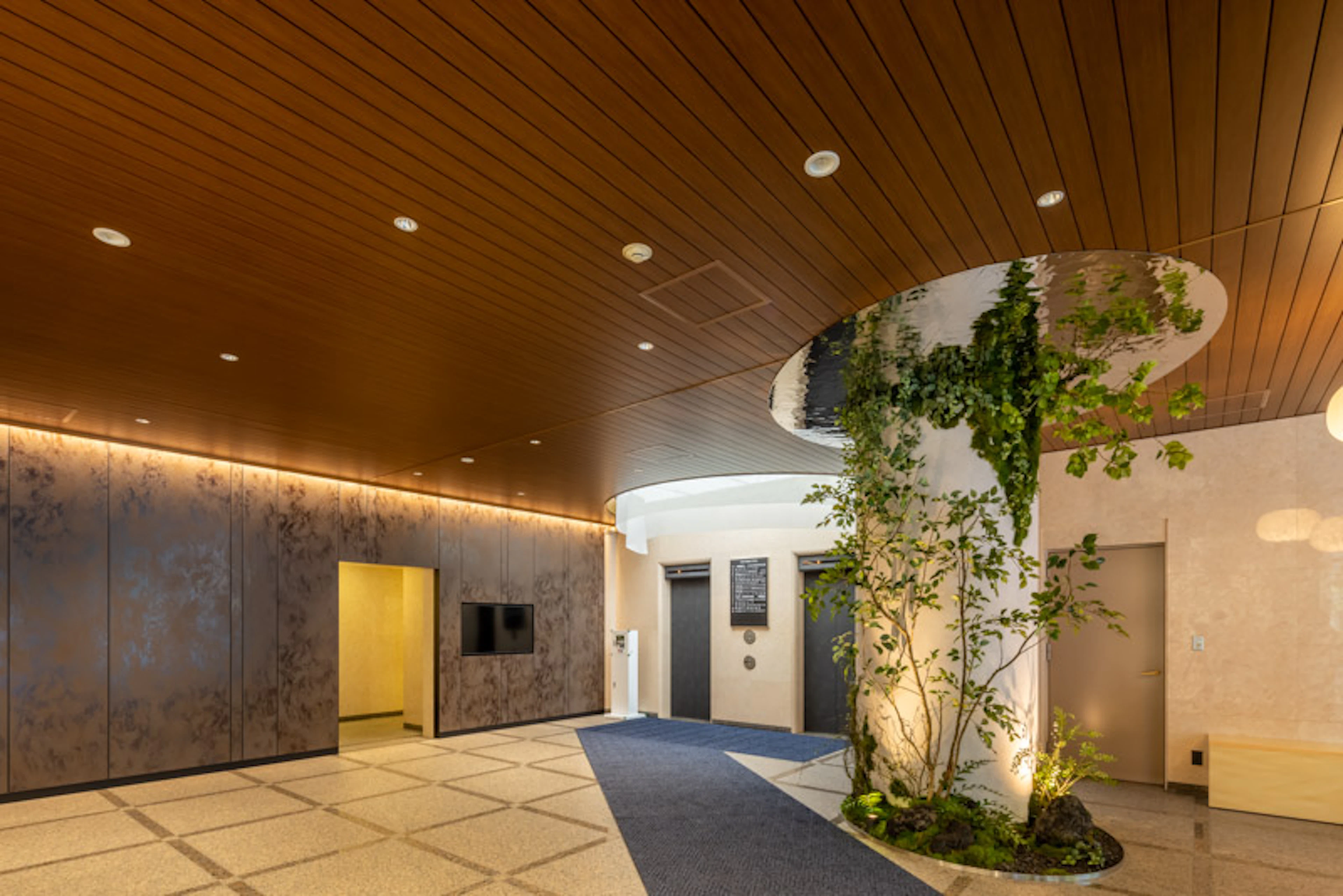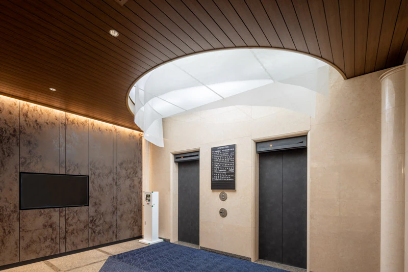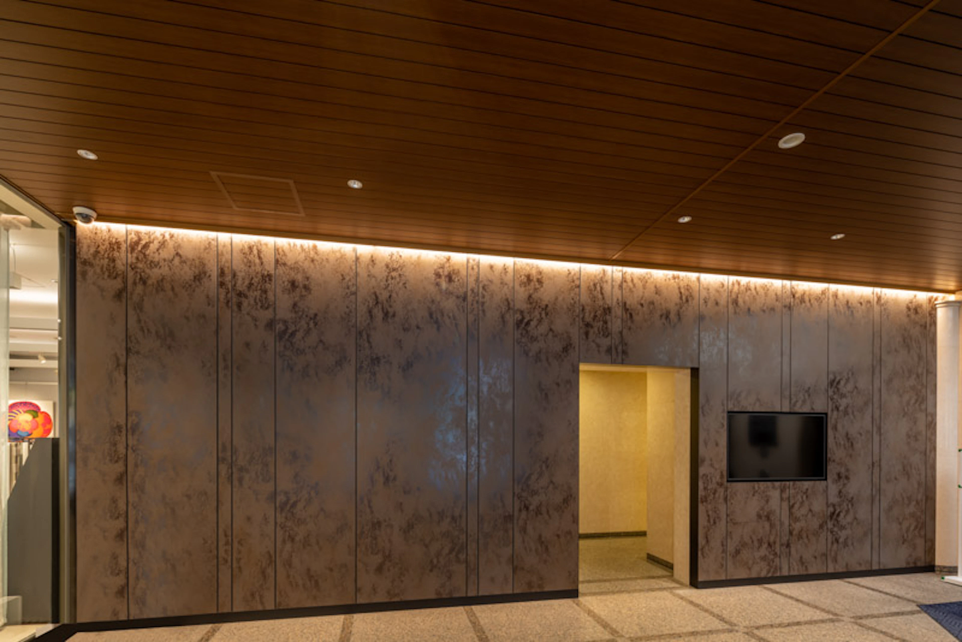 フロア全体はウォールナット柄の天井スパンドレルと存在感のあるオキサイド柄のセラミックタイルで構成し、木質の温かみと光によって表情を変えるテクスチャの質感により、都会的で落ち着きのあるエントランス空間を実現しています。