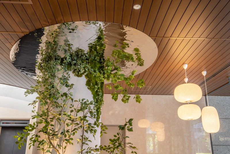 入口近くの大きな柱をアイキャッチスペースとして活用し、柱周りに緑とベンチを新設。柱周りの天井にはステンレス板(水面加工)を使用することで、緑の映り込みや水面の揺らぎによる立体的な繋がりを表現しています。