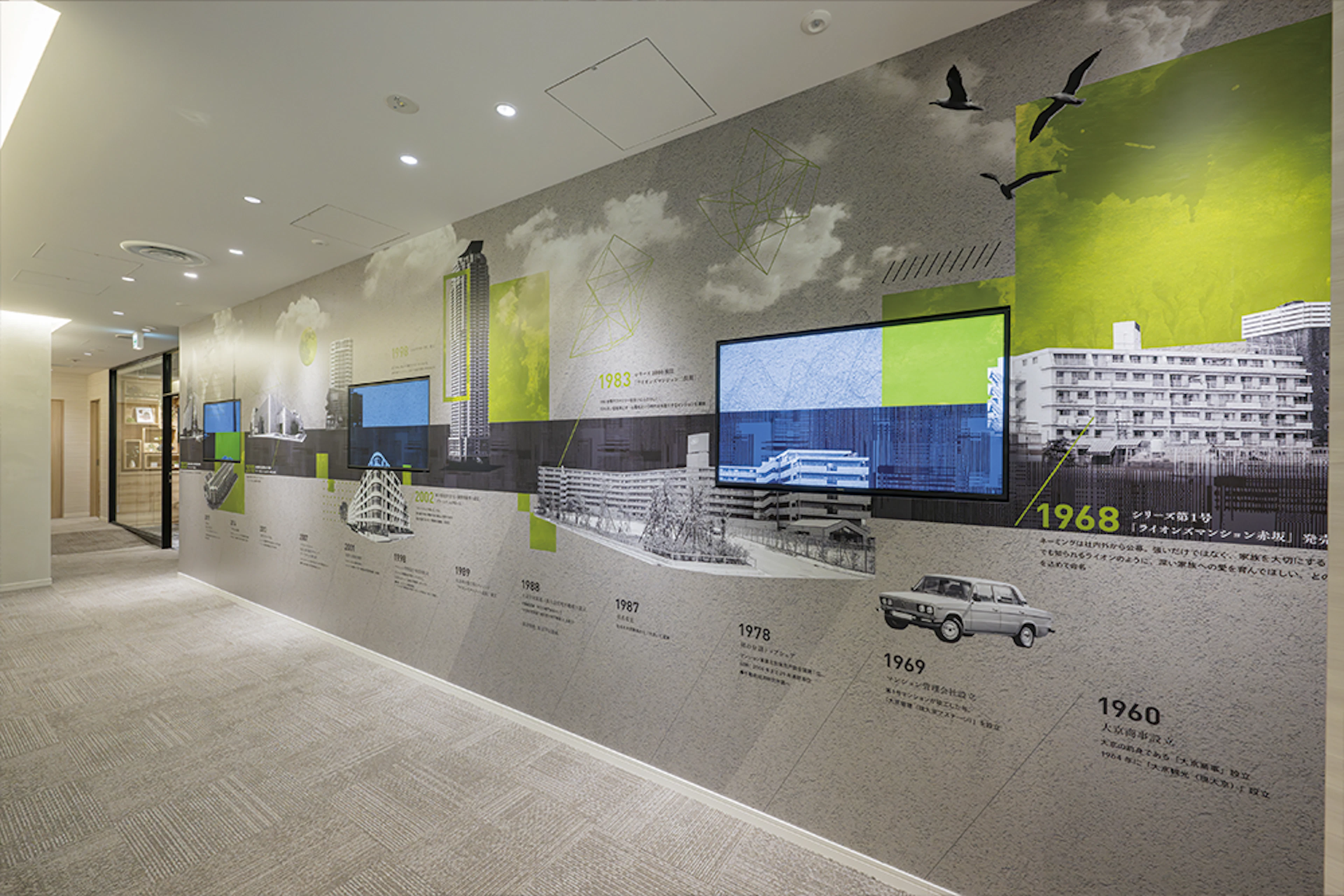 空間デザインでは、インパクトのあるエントランスを起点に、歴史をインタラクティブに表現した壁面グラフィックや、未来への思いを表現したシアターなど、多様なコンテンツを配置。
