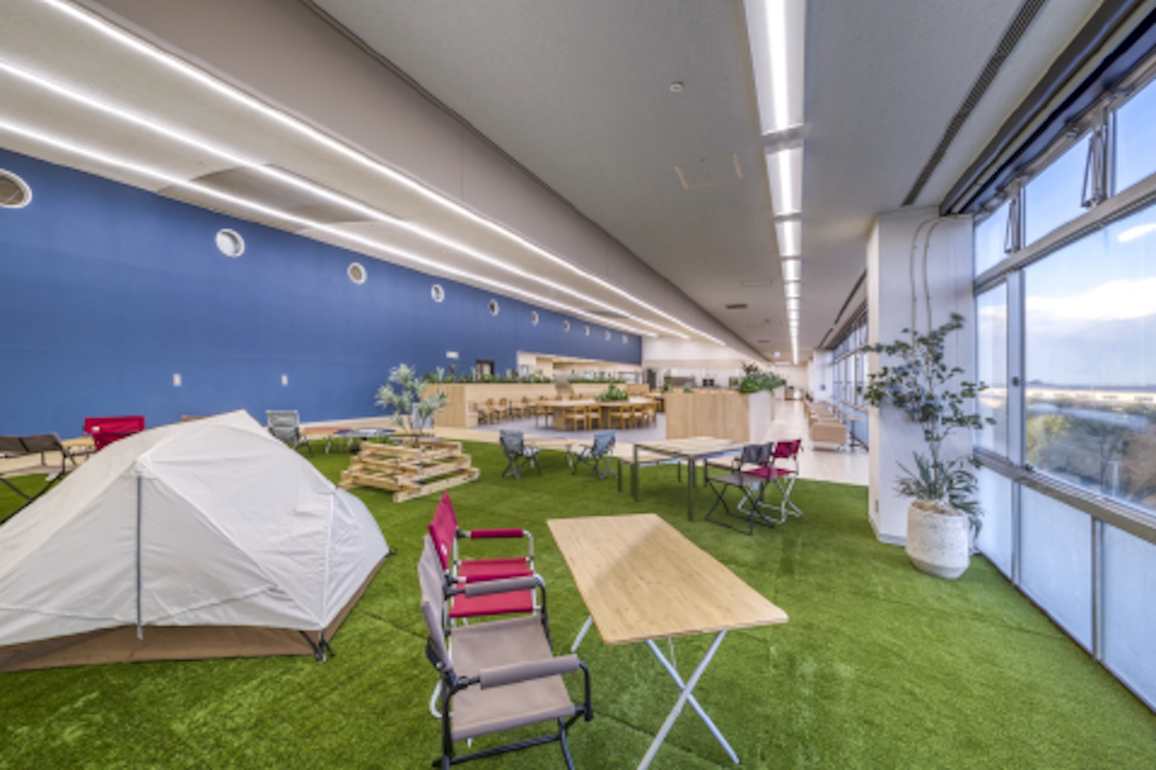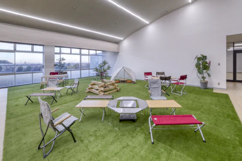 また、「SUBARU 手ぶらCAMP by Snow Peak」に着想を得たガーデンエリアには、テントや薪を設置することで、まるで屋外のように開放的な空間を実現。従業員同士の交流からやりがいが生まれる場として機能しています。