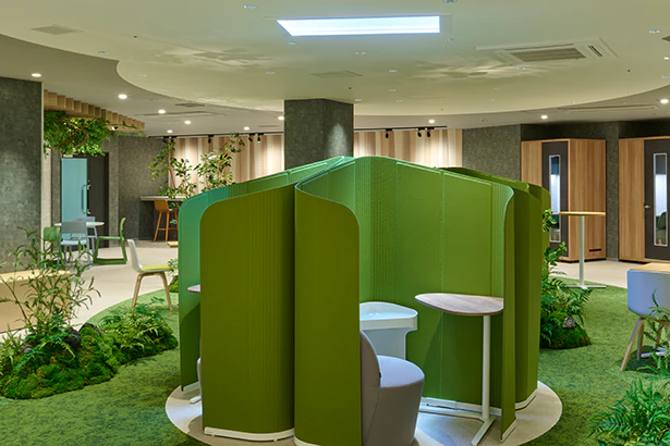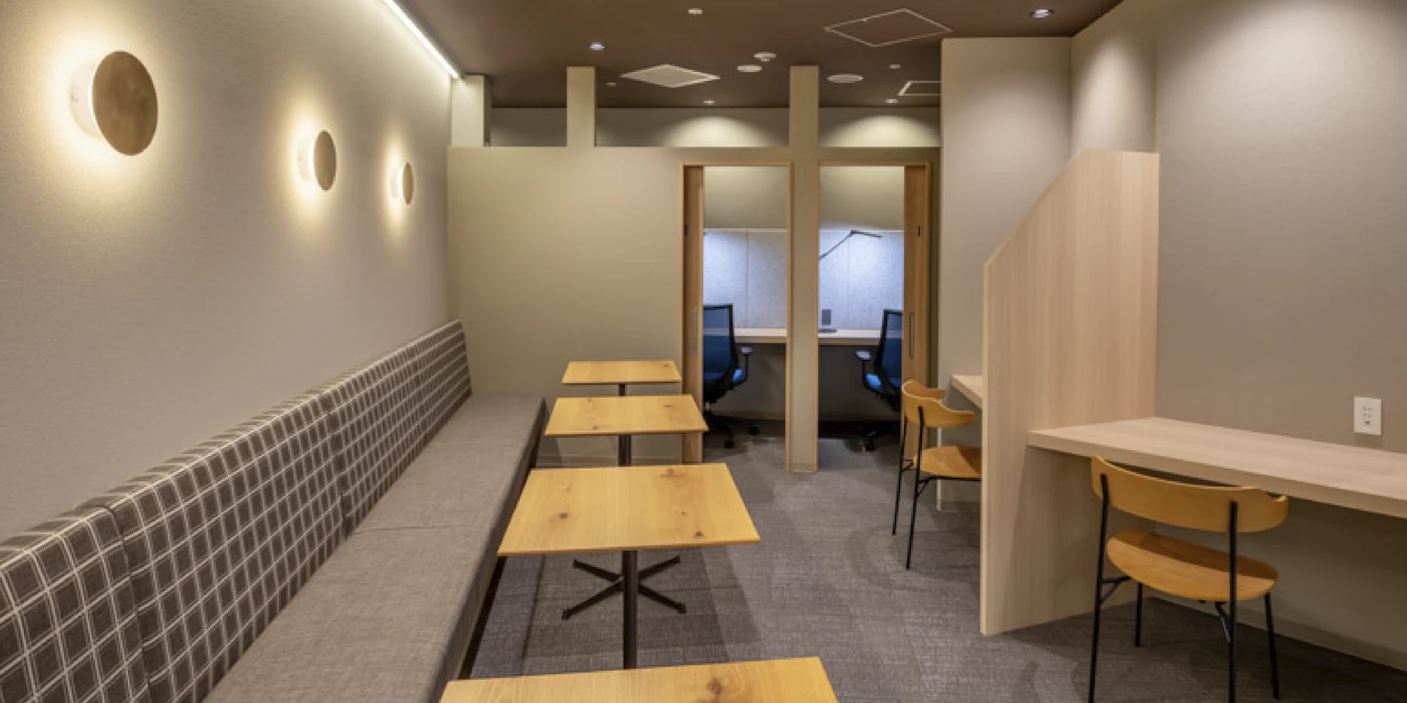 カフェのように寛ぎながらリモート会議ができるベンチ席や、壁を向いて作業に集中できるデスクカウンター、プライバシーを確保しながら集中できる半個室ブースなど、多様な働き方に対応しています。