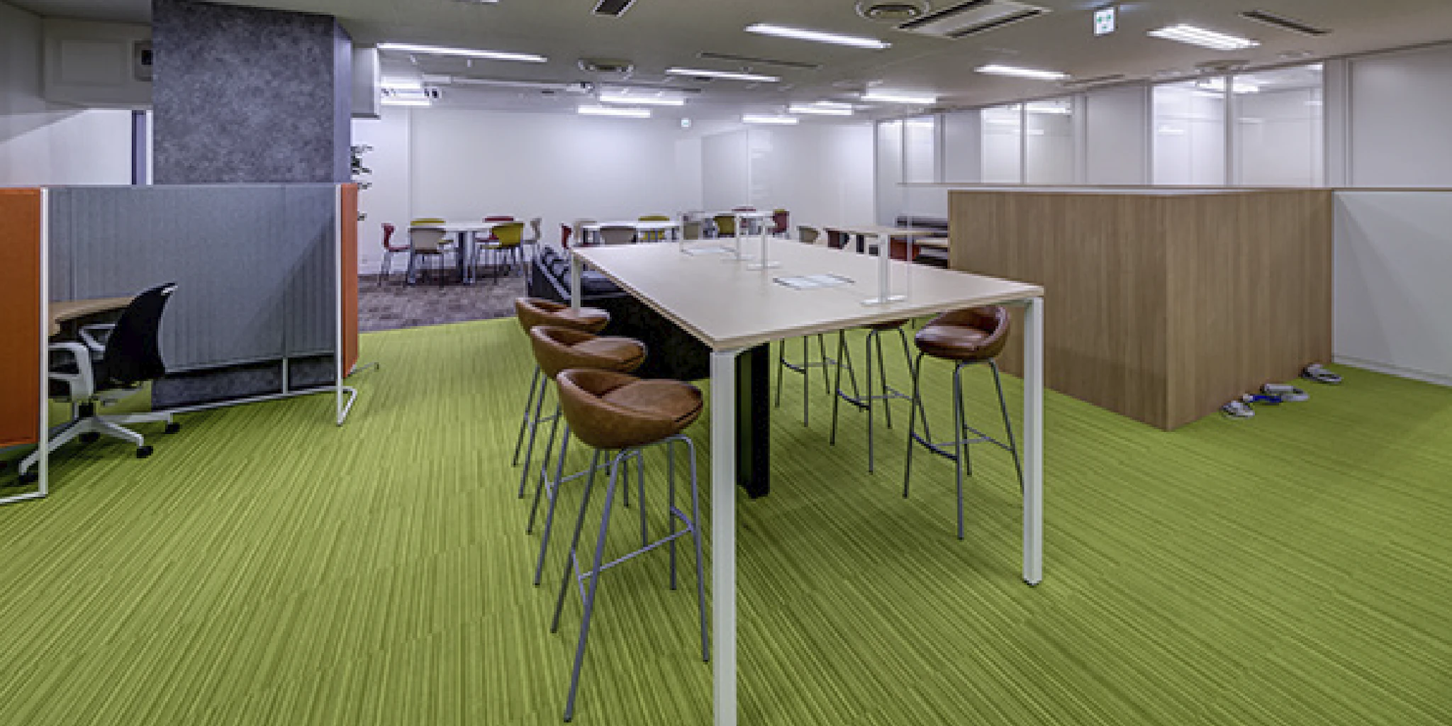 特にグループでの利用を想定したテーブル席は、部署を越えた交流を促進する効果が見込めます。また、事業に関連したフェイクグリーンの壁面は、社員に愛着を持ってもらうための仕掛けとしても参考になる事例です。