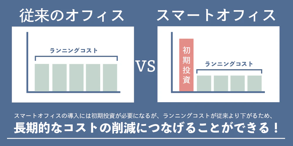 スマートオフィスの導入に伴い、インフラ整備に関わる初期投資はもちろん必要ですが、一方でランニングコストを削減しやすくなります。例えば、光熱費やオフィスの賃料など、使っていない場所の照明やエアコンを自動で感知して消したり、テレワークや在宅勤務を行う社員を見込むことで、オフィスを縮小したりすることで、長期的なコストの削減、固定費の節約を行うことができます。
