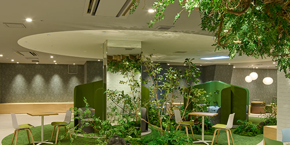 埼玉県川口市に本社を置く日本地工株式会社様では、社員食堂の改修にあたり、フェイクグリーンを活用した空間づくりを実現しました。壁面デザインにフェイクグリーンを取り入れることで、本物の植物を維持管理するコストや手間を抑えながら、緑あふれる癒しの空間を創出しています。