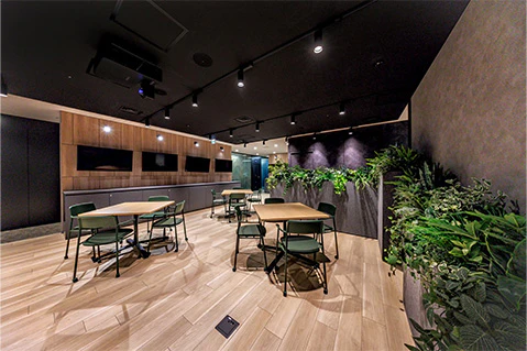 自社のフェイクグリーンを活用した壁面デザインやオリジナルの休憩席を設置することで、従業員が愛着を持てる空間を創出しています。