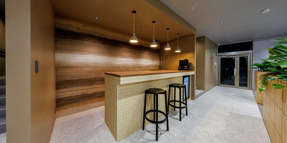 「社員のやる気向上をもたらす空間づくり」をテーマに、エントランスから専有部まで一貫したデザインを展開しています。エントランスにはCAストーンや左官などの上質なマテリアルを採用し、高級感のある空間を創出しています。