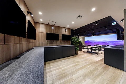 「従業員やお客様がすれ違い、出会い、企業や事業の垣根を越えて共創していく場」として新設された来客スペースです。商材を効果的に紹介できるサイネージやプロジェクターを設置し、単なる展示エリアを超えた「コト」の創出を促進する空間となっています。