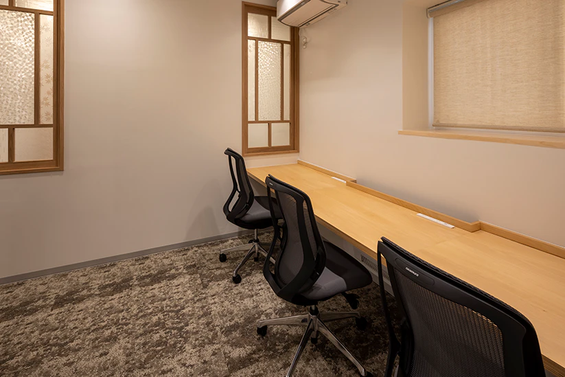 好アクセスな立地を活かし、出張や社員の出入りが多い企業をターゲットとして想定しています。中央には造作カウンターを設置し、ファミレスブースや小上がりスペースなども配置することで、多様な働き方に対応できる柔軟な空間を実現しています。
