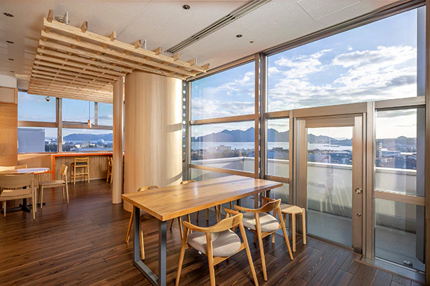 地域の中心産業である木材や加工技術を内装に活かすことで、地域性を反映した特徴的な空間を実現。宮島の眺望を活かした配置と、地域産業の特色を活かした内装により、地域との強いつながりを感じられる空間となっています。