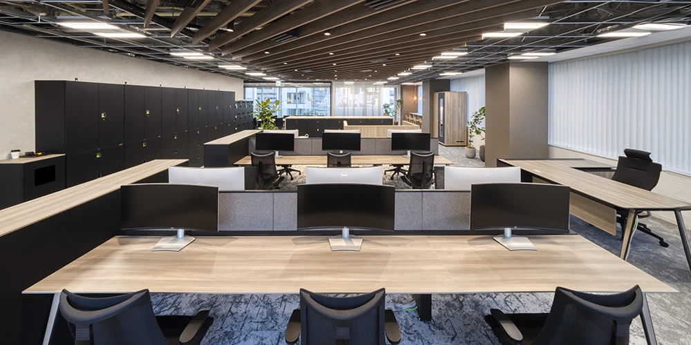 株式会社NICHIJO様では、メインのワークスペースをフリーアドレス仕様とし、従業員が自由に席を選べる環境を整備しています。背の低い什器で構成することで、誰がどこにいるのかをすぐに確認できるレイアウトとなっており、スムーズなコミュニケーションを実現しています。