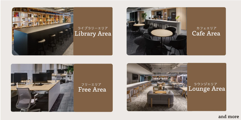 expace officeには、気分や業務内容に応じて仕事に取り組める様々なワークスペースがあり、社員は自由に働くエリアを選ぶことができます。