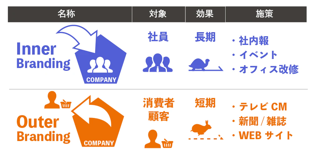 一方、インナーブランディングは、企業の成長や社員のエンゲージメントアップといった長期的な利益を目的として行う施策です。時間がかかり効果が短期的にわかりづらいため、ないがしろにされやすい取り組みではありますが、ブランディングにおいてはアウター・インナーどちらの取り組みも重要です。