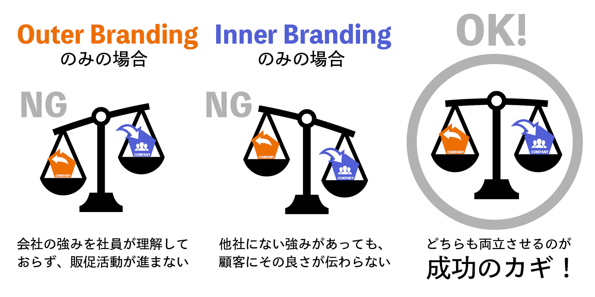 アウターブランディングだけに力をいれようとしても、それを行う社員の企業理解が進んでいなければ最適な施策を行うことはできません。また、インナーブランディングだけに力をいれようとしても、他社にない強みが肝心の顧客に伝わらない事態に陥ってしまいます。