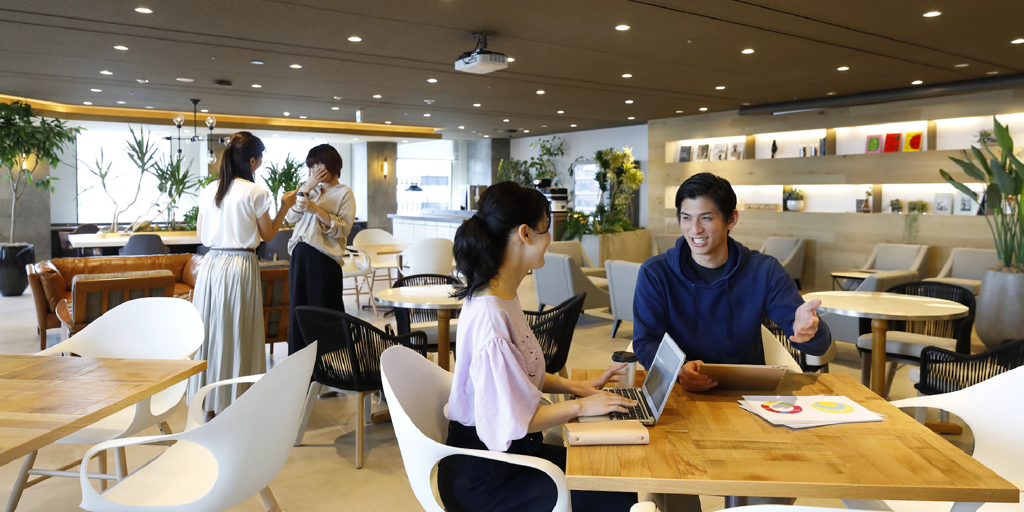 固定席でない分、出社するたびにさまざまな人と接して会話することができます。これにより、部門をまたいだコラボレーションを促進することができます。