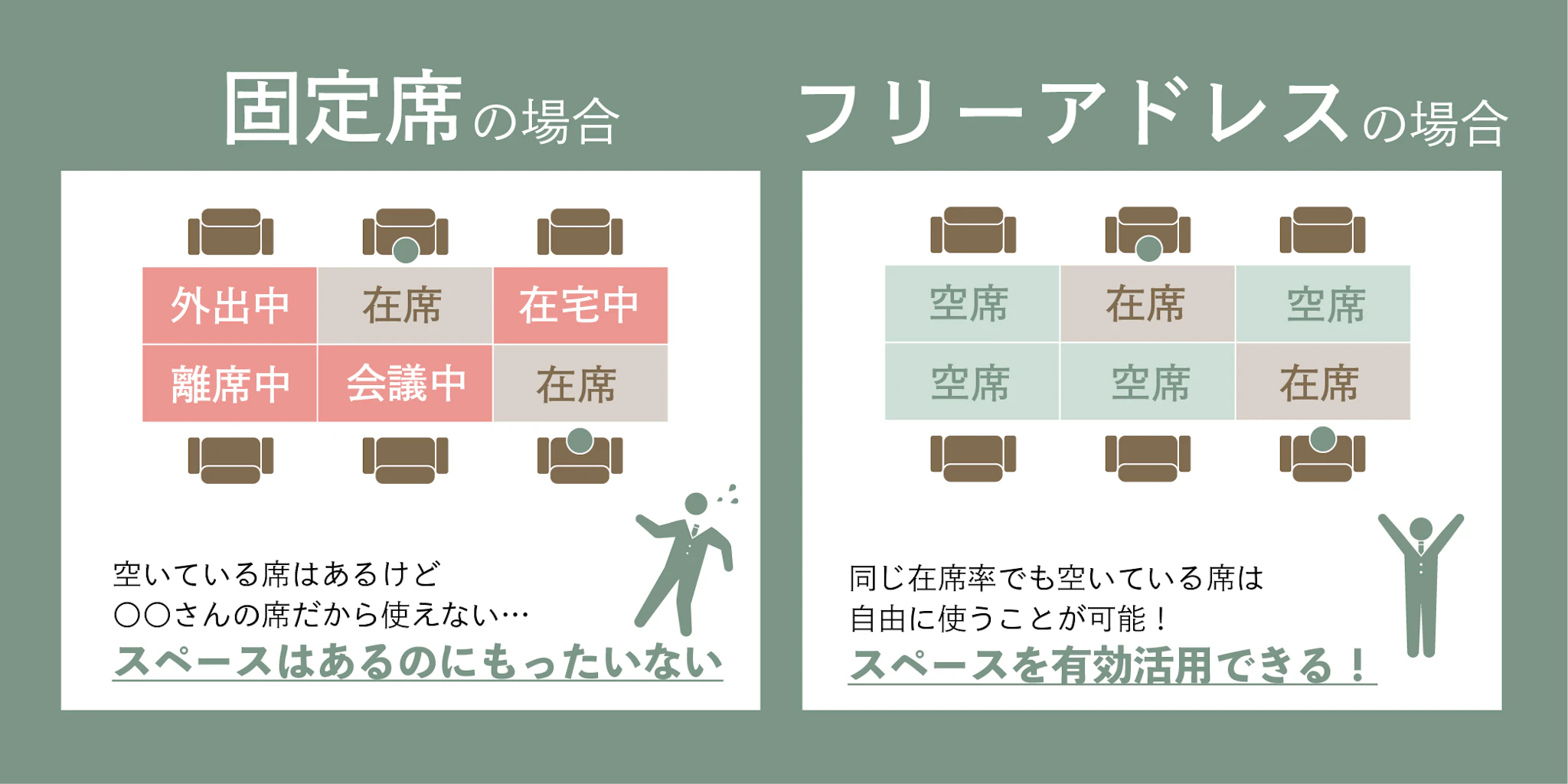 固定席の場合、基本的に社員が在席でも離席でも外出中でも、その席のスペースが空くことはありません。一方でフリーアドレスの場合、外出や離席している社員のスペースは確保しなくてよいため、その分、オフィスの限られた空間を有効に使用することができます。