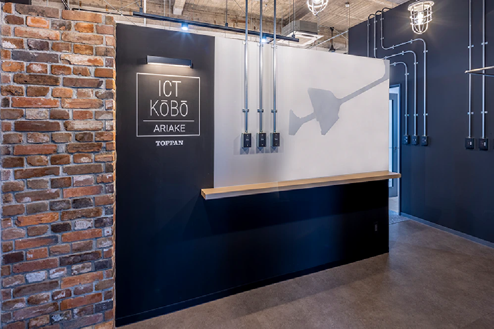 3拠点目のARIAKEは、明治から戦後にかけて石炭産業で隆盛した福岡県大牟田市にあり、ICT KŌBŌ® が入居するのも昭和11年竣工の旧大牟田商工会議所をリノベーションした歴史的な建物です。建物自体がもつ魅力として、当時から使用されている腰壁を残し、重厚な梁を剥き出しで使用したほか、地域の特性として炭鉱施設で当時使用されていたレンガや、炭坑内で使われていたランプをイメージした照明器具を取り入れています。
