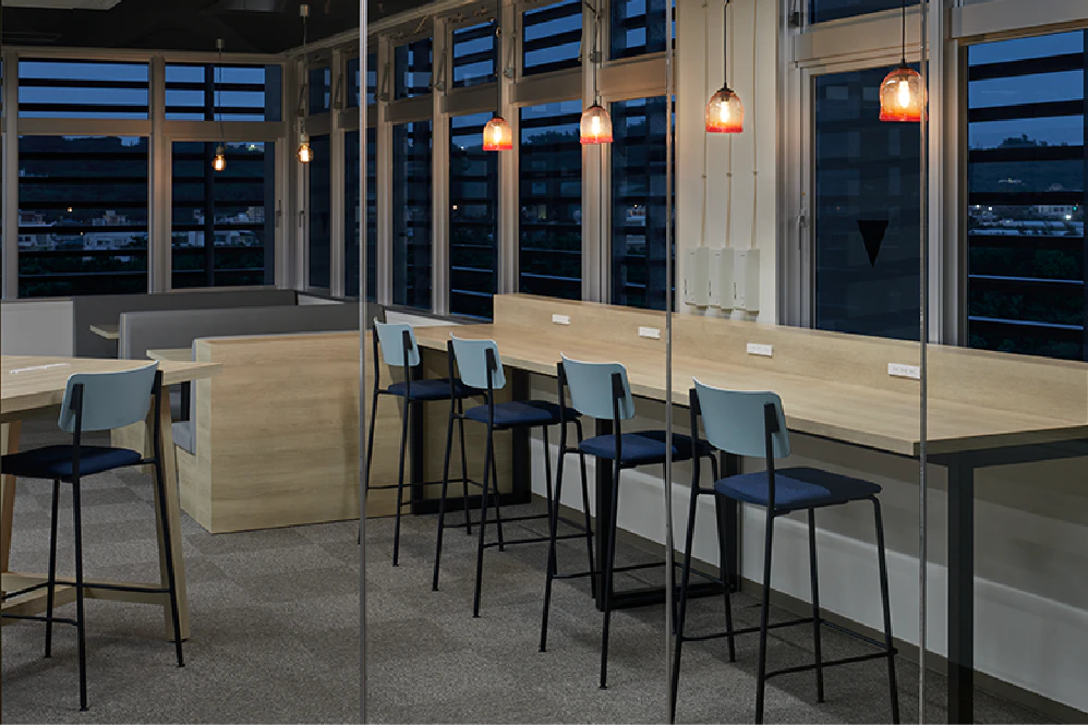 企業としてのオフィスというだけでなく、地域の人ともつながれるように、シームレスな空間に仕上げています。基本的にABWを導入しているため、オフィスも当然フリーアドレスになっていて、心地良く快適に過ごせる内装を心掛けました。ICT拠点ということで、全拠点に共通して執務エリアには全席に大型のモニターを設置し、長時間座っていても疲れない椅子を導入しています。