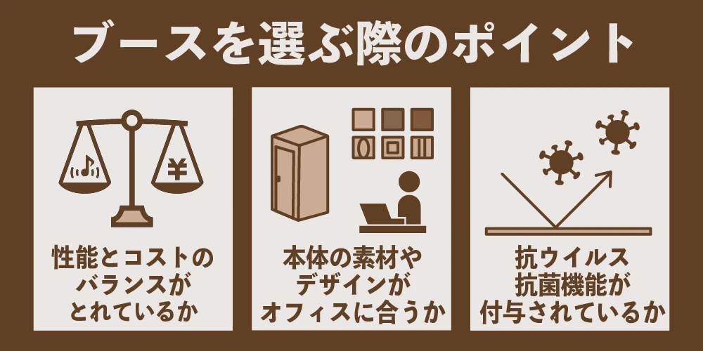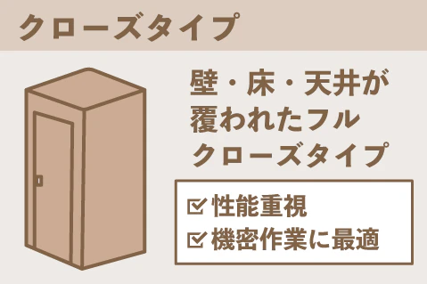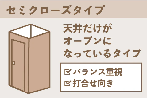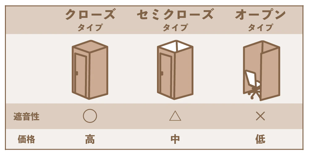 使用する人数や用途に応じてオープンタイプ、セミクローズタイプ、クローズタイプなどの中から導入するタイプを決定します。この際、遮音性やコストパフォーマンス、使用している素材の観点から数社を比較して検討することがマストです。