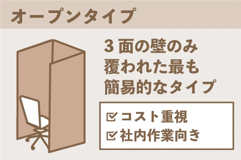 もっとも簡易的なタイプの集中ブース。前・左右の三方向は囲まれており、背面・天井はオープンになっているタイプです。上の2タイプに比べて音や作業内容が外に漏れやすいため、機密性の高い作業には向いていません。