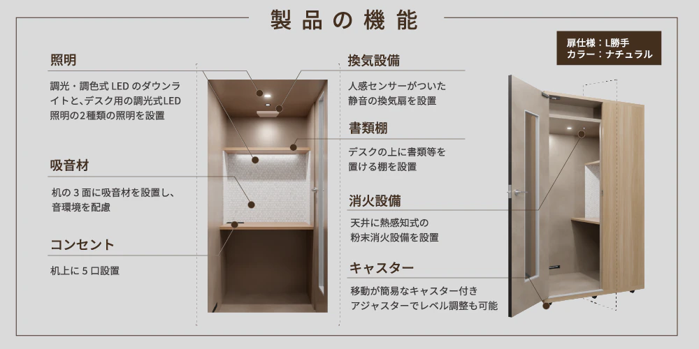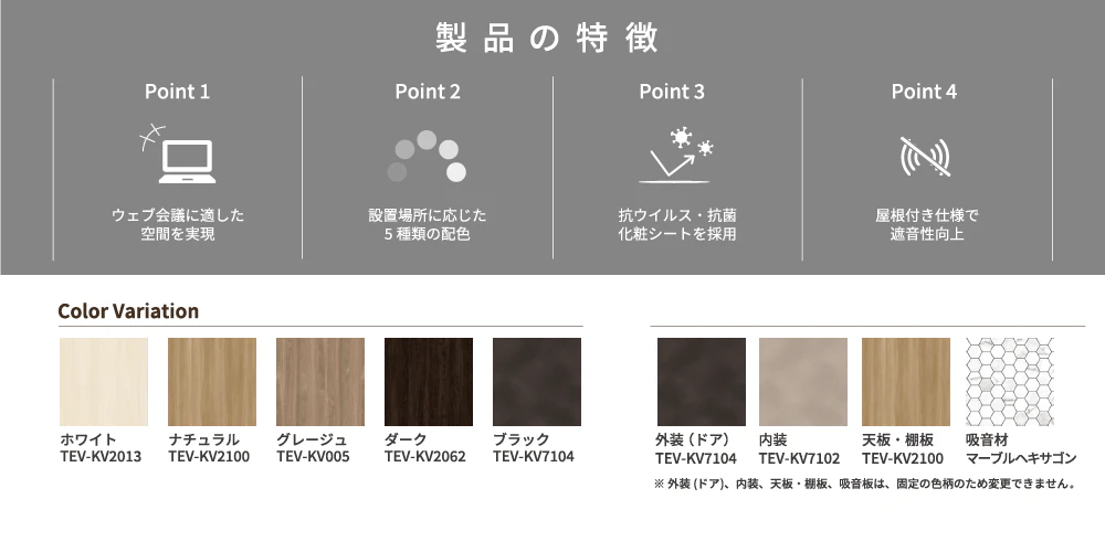 抗ウイルス・抗菌シートを採用するなど、ウェブ会議に適した空間づくりを軸に作られた製品です。