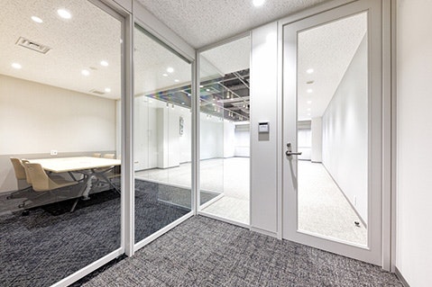 ミーティングルーム内。ガラスで仕切ることで解放感を演出。