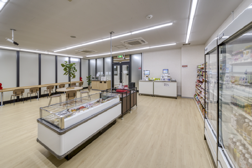 キッチンエリア内の売店。食堂内と内装を合わせることで気軽に入ってもらいやすい空間に。