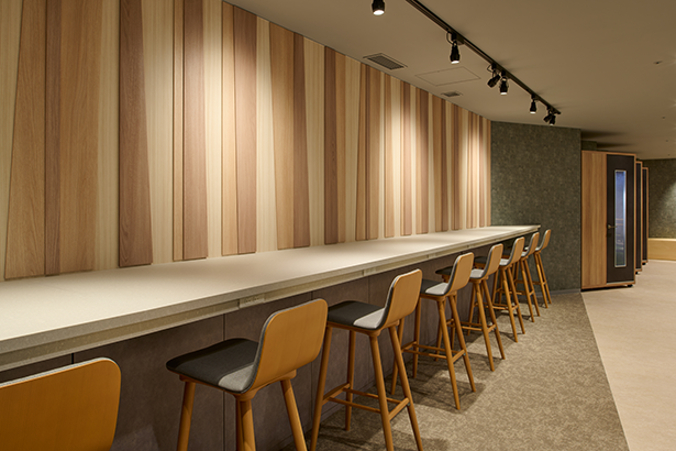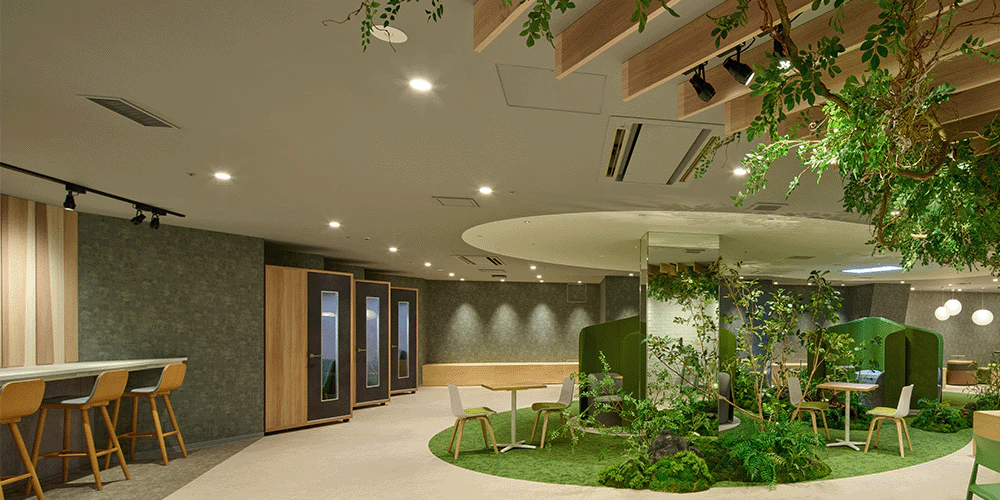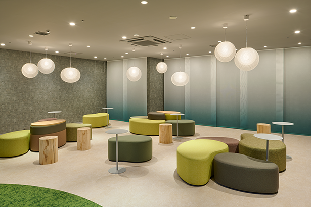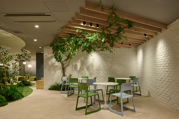 デザインコンセプトを「地下2階のGreenParkが繋ぐ共用空間」とし、緑をふんだんに取り入れた地下を感じさせない明るい雰囲気で、開放的な空間にしました。利用されるテナント企業の方が快適に過ごせるよう、多様なエリアを設けることで、目的に応じた使い分けができるように企画・設計を行いました。