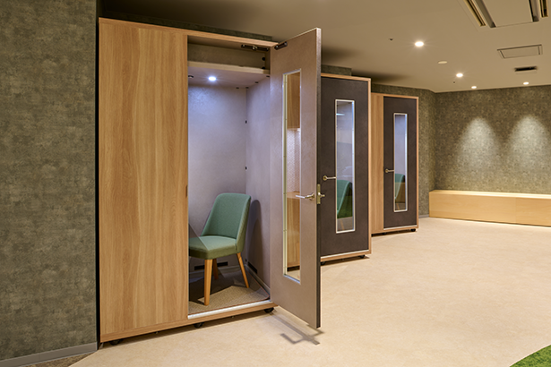完全個室タイプの「トッパンテレワークブース」を設置。オンラインミーディングや集中作業に最適。