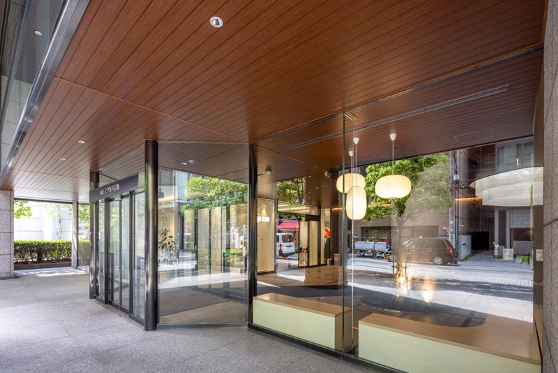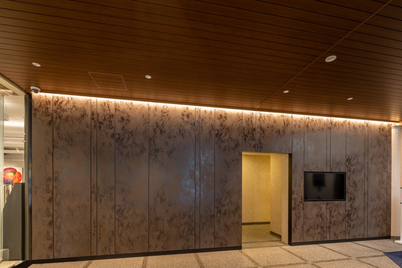 フロア全体の意匠はウォールナット柄の天井スパンドレルと、存在感のあるオキサイド柄のセラミックタイルで構成しました。木質の温かみと光によって表情を変えるテクスチャの質感が、都会的で落ち着きのあるエントランス空間を創出しています。屋外軒天と屋内天井は色柄を統一することで、空間に拡がりを持たせました。