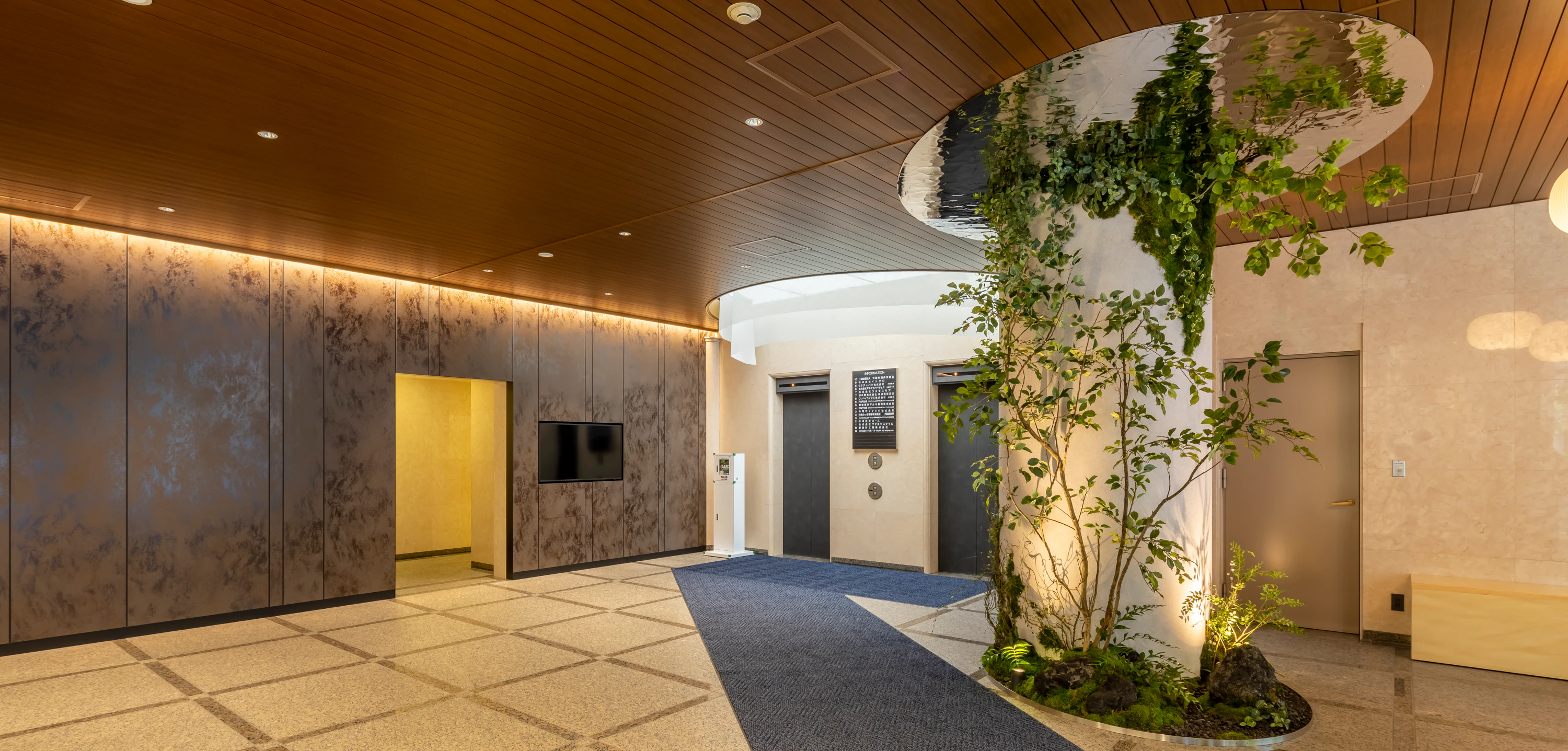 入口近くの大きな柱をアイキャッチスペースと捉え、柱周りに”緑”とベンチを新設しました。柱廻りの天井にはステンレス板(水面加工)を使用することで、緑の映り込みや水面の揺らぎで立体的な繋がりを表現し、テナント企業の方や訪問される方が心地よく立ち寄れる場所に仕上げました。