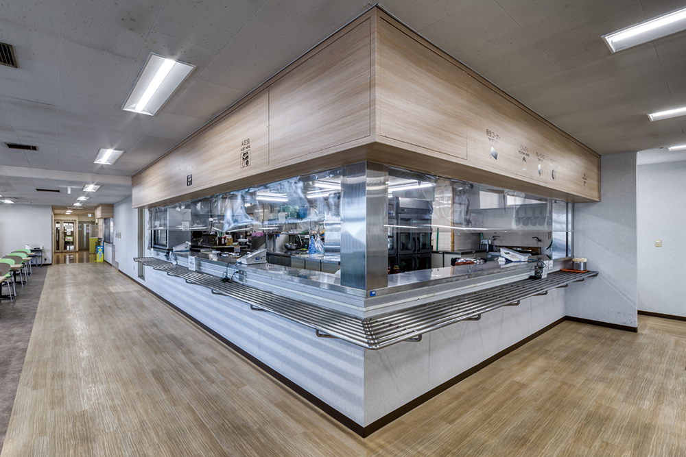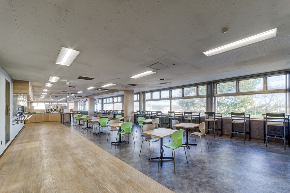 また、派手になり過ぎないように家具の張地色等でバランスを取り、食堂を利用する幅広い世代に長く愛される空間を目指しました。