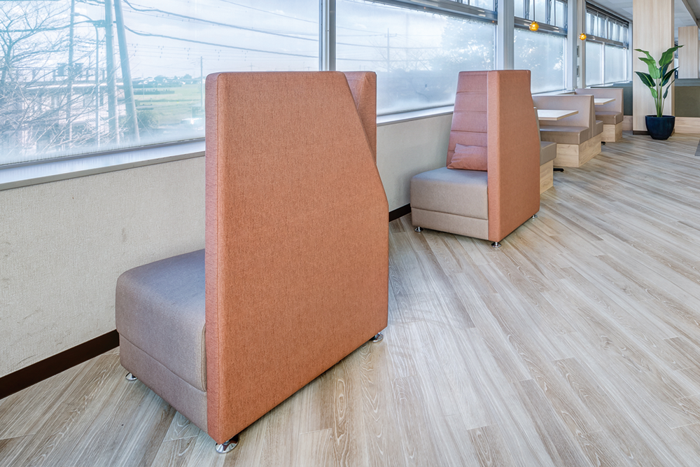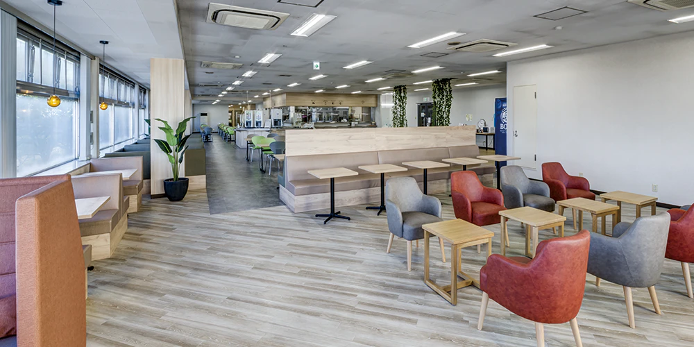 リニューアルに際し、「飲食スペースの無駄を解消したい」「単独利用が多いため、1名用の座席を用意したい」「若手人材獲得のアピールになるような魅力的な空間にしたい」とご要望をいただきました。