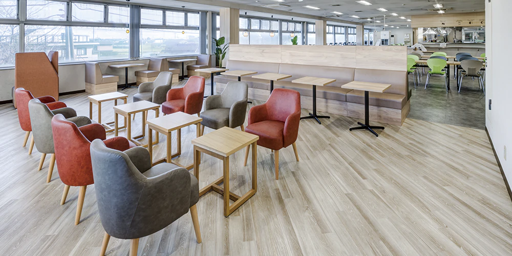 家具形状とレイアウトを整理して席間や通路幅の確保と、床デザインの貼り分けによる動線の整理を行いました。