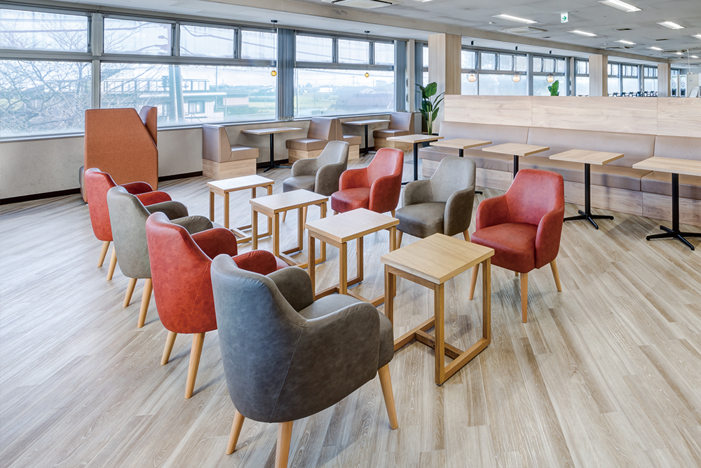コロナ禍の提案であったため、感染対策も兼ねつつ、ゆったりリラックスして利用して貰えるよう、席間の距離を十分に確保したレイアウトとしました。
