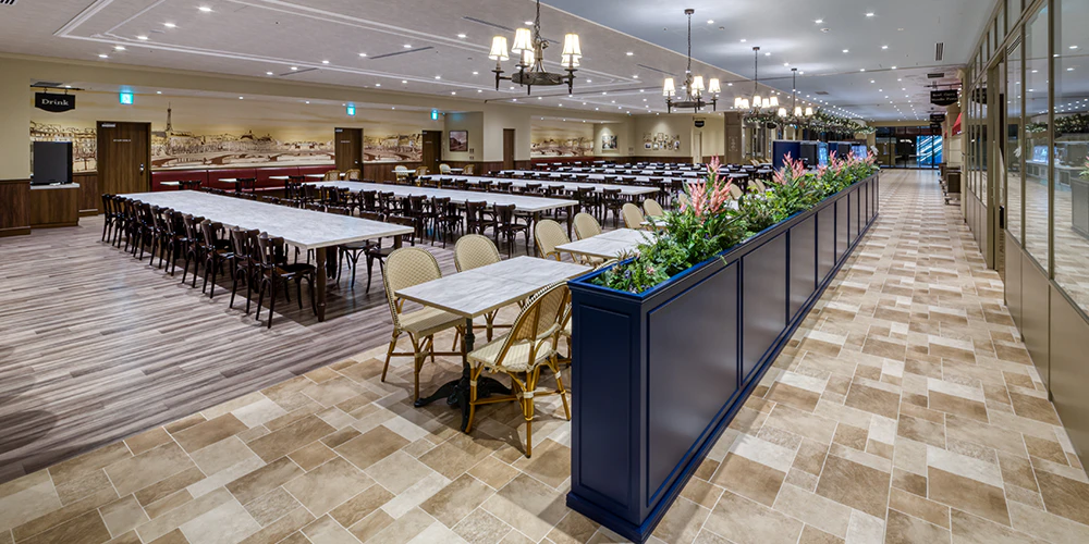 屋内エリアは室内のような木目調の床や椅子を使用することで、落ち着きのある空間としました。