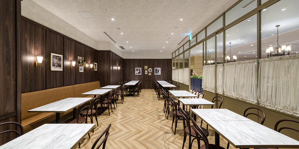 テラス席をイメージした屋外エリアと、カフェの室内のような屋内エリアを分けてデザインしました。