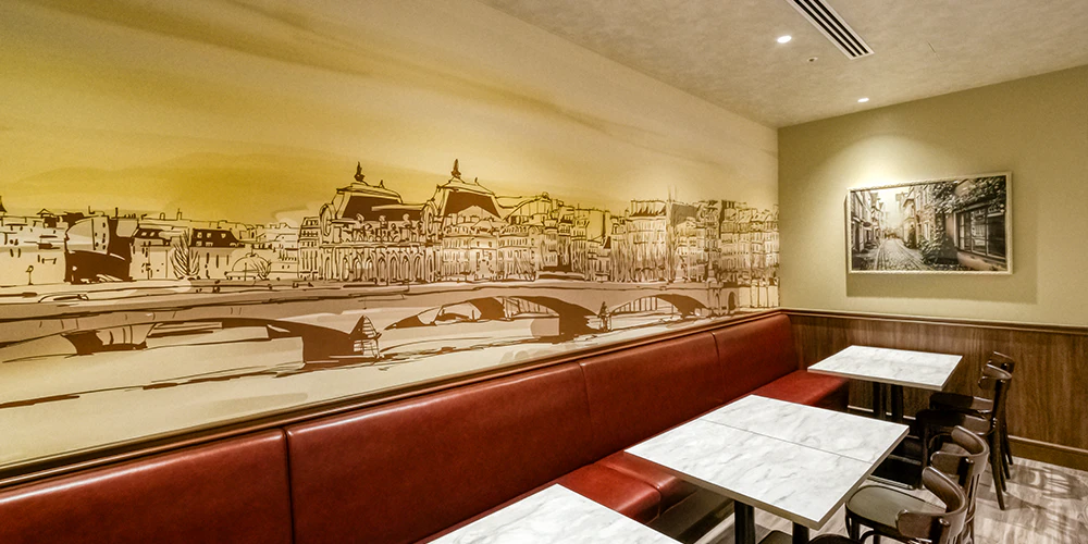 またパリの景色をデジタルで描いたオリジナルの壁面クロスを貼ることで、空間に独創性をもたらしています。