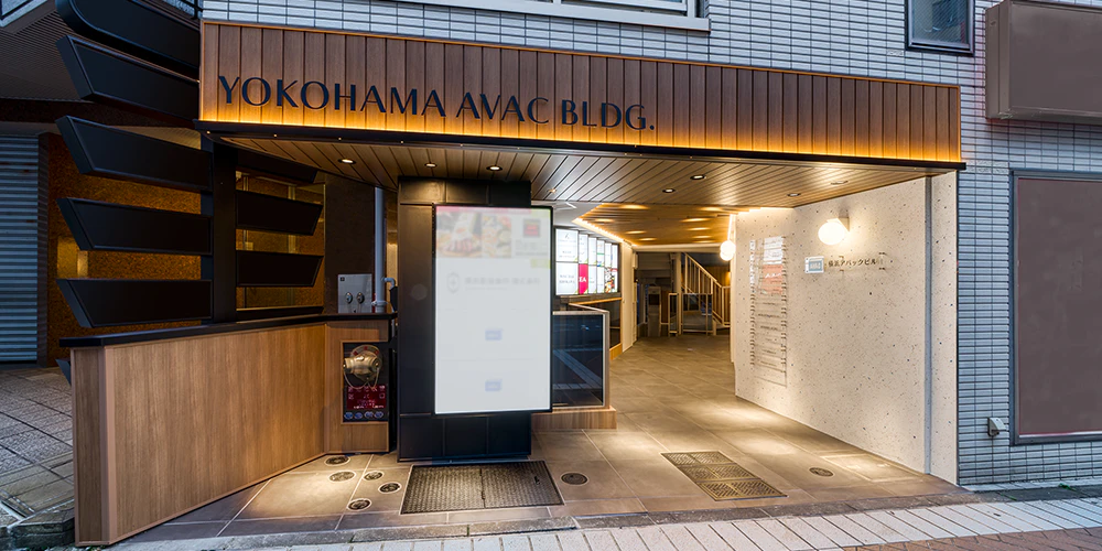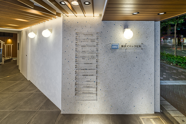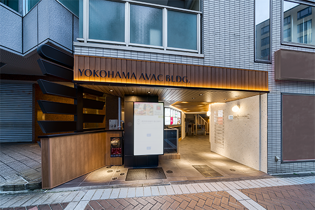 天井、ビル正面上部サイン、目隠しフェンスに同じ色柄のシートを使用することで全体的な意匠の統一感をもたせたほか、 壁面の左官には青色を基調としたビールストーンを使用し、港町である横浜の海を連想させるデザインに仕上げました。